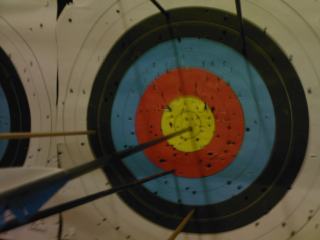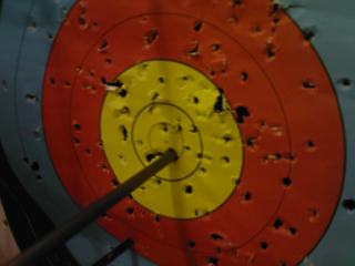 Anyway, why is it only now I’m able to speak of it? Because after weeks of such failure, I’m now able to hit the wee coloured rings rather than the bits of wood surrounding it a lot more. However, the accuracy seems to be a bit all over the damn place. Having said that, here’s the first time I randomly and wildly shot at the target which happened to land in the centre ring, which is not called a bulls-eye (although saying that makes me want to shoot at a pub dartboard from 18 metres away to see if I can get a decent 180 and invent archery darts. Anyway I digress. Here’s my first 10: